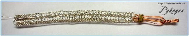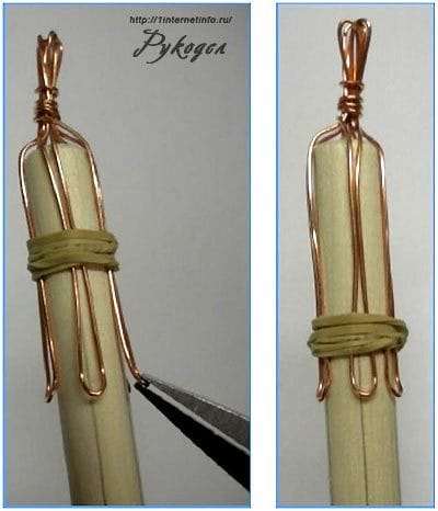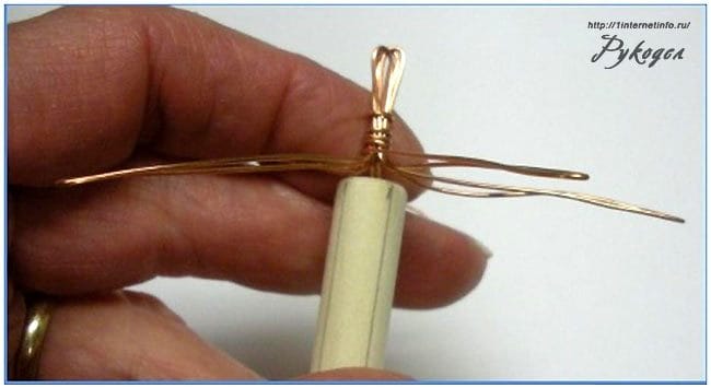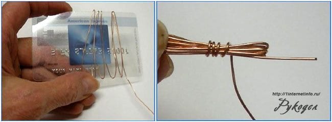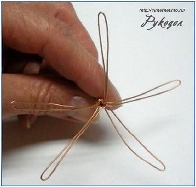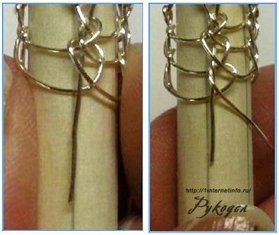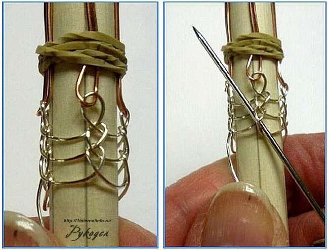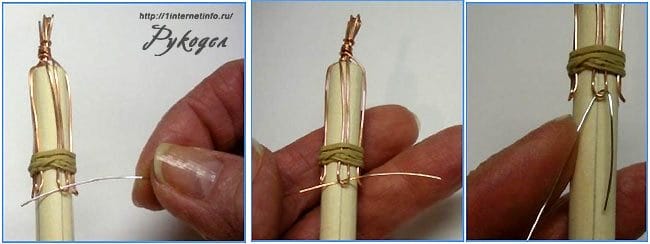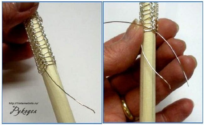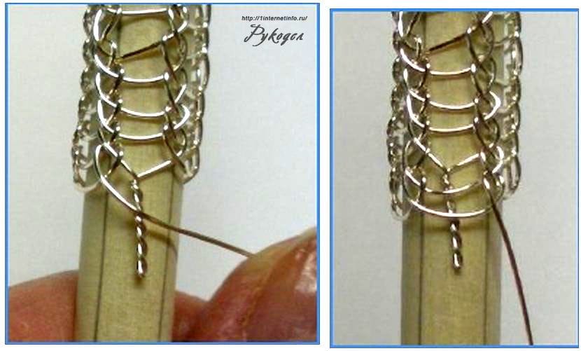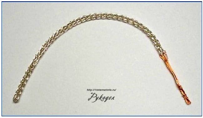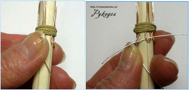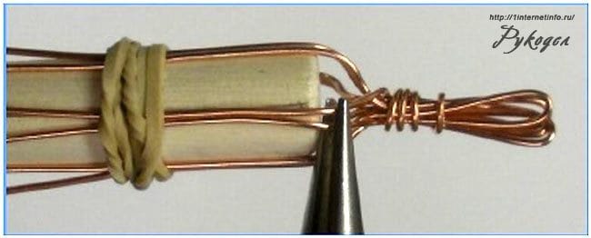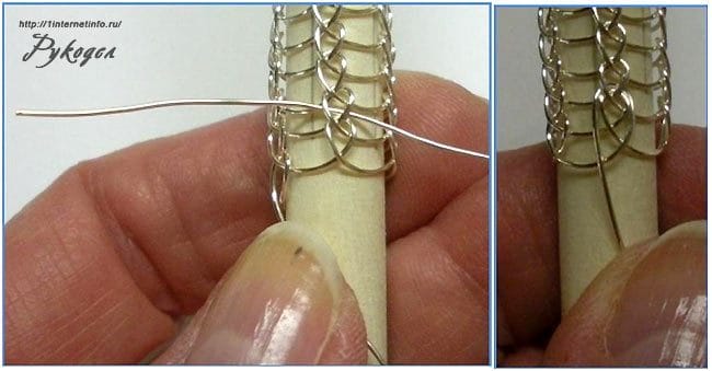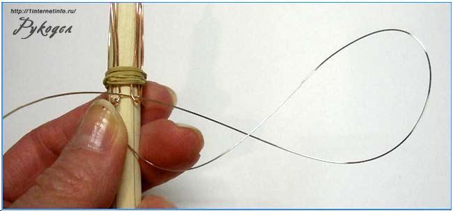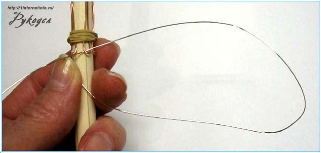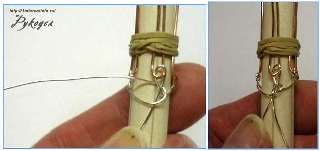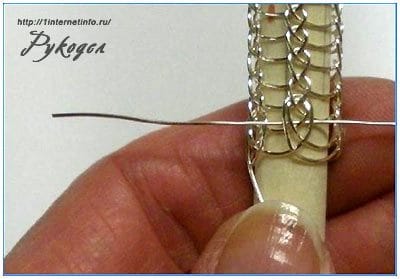 Когда у вас закончится проволока нужно взять следующий кусок и просто скрутить кончики проволоки между собой и продолжать плетение. В дальнейшем добавляйте проволоку по мере надобности таким-же способом. После заключительного действия — сжатия жгута скрученные кончики спрячутся внутри изделия.